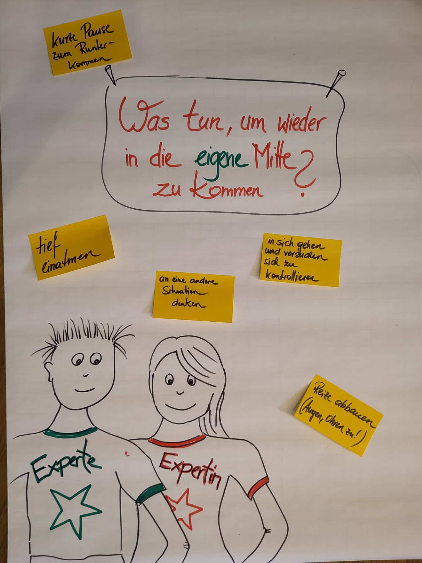 Viele hatten bereits wertvolle Tipps, wie sie sich besser abgrenzen können und wie es möglich ist, bei sich und in der eigenen Mitte zu bleiben. Gemeinsam sammelten wir Ideen, die helfen können: