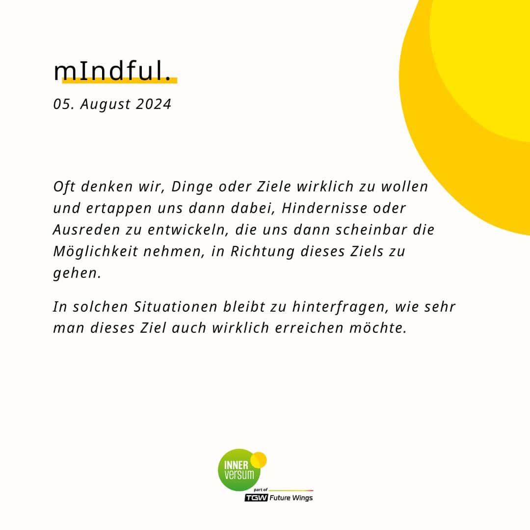 In Situationen, in denen immer wieder Hindernisse oder Ausreden auftauchen, dieses oder jenes nicht zu tun, bleibt zu hinterfragen, wie sehr man dieses Ziel wirklich erreichen möchte. Mit der heutigen Übung laden wir dich ein, dir dazu folgende Fragen zu stellen …