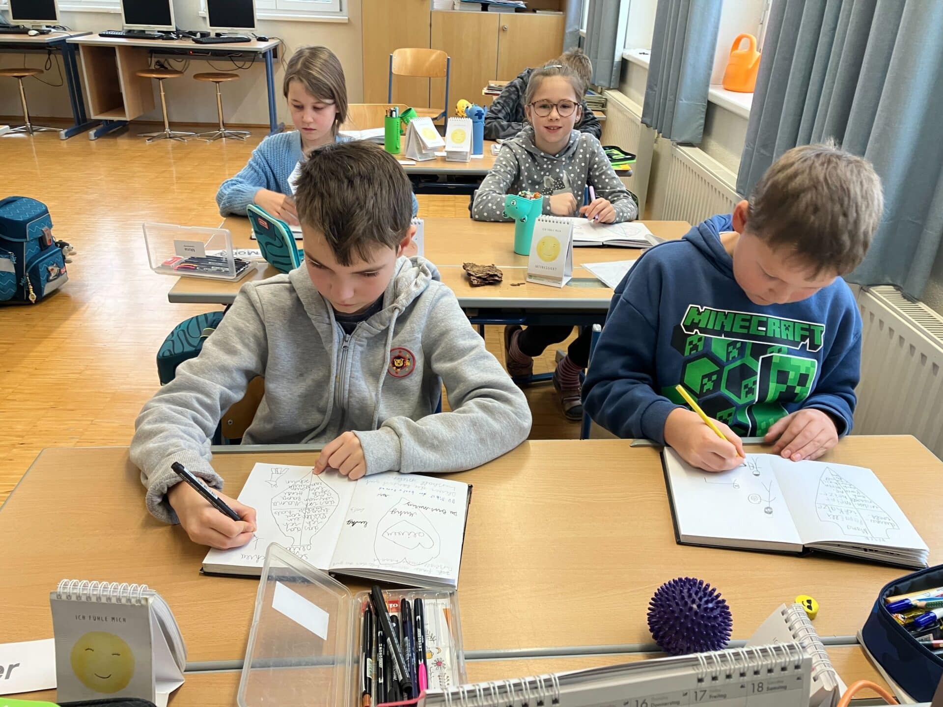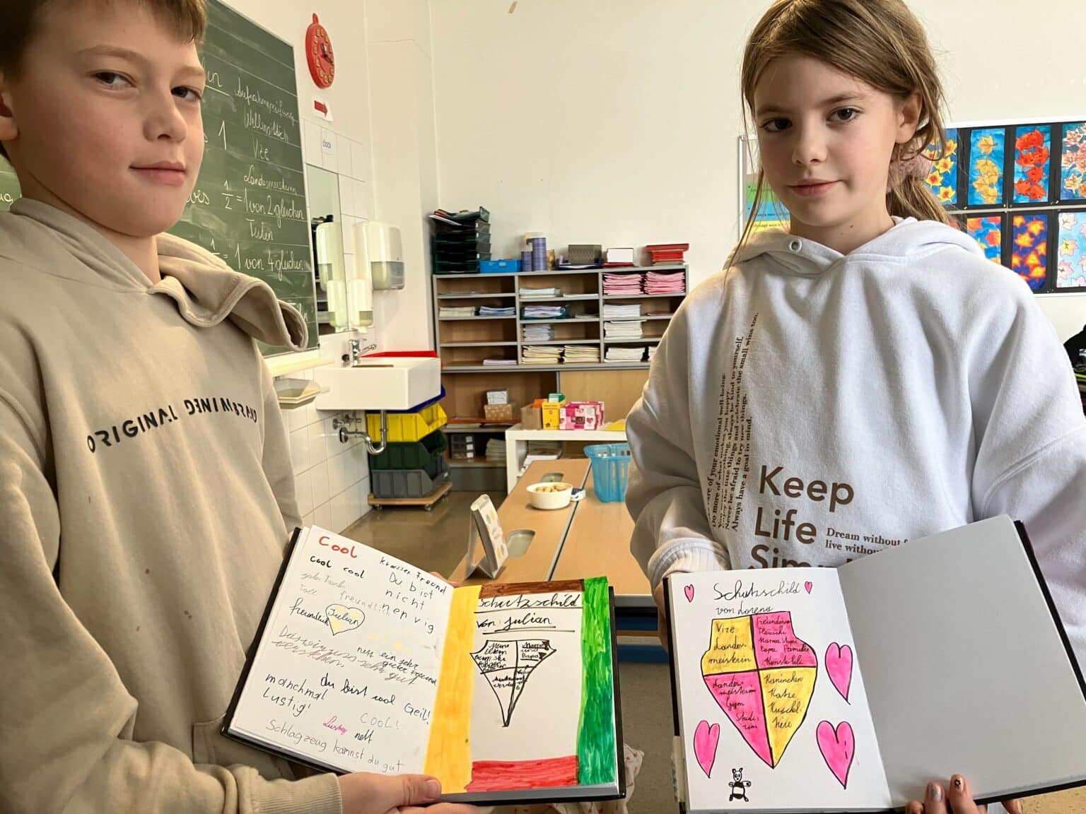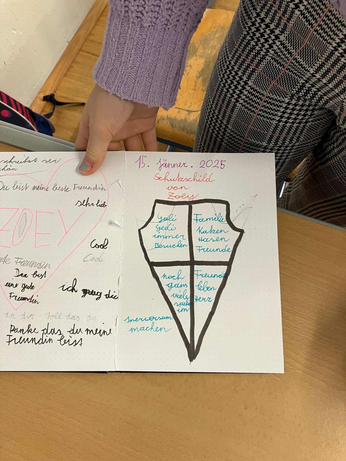 - Innere Stärke sammeln: Die Kinder durften ihr eigenes Schutzschild ins Glückstagebuch zeichnen – gefüllt mit Dingen, die sie stärken: Was ist mir wichtig? Was sind meine größten Abenteuer? Was möchte ich noch erreichen?
