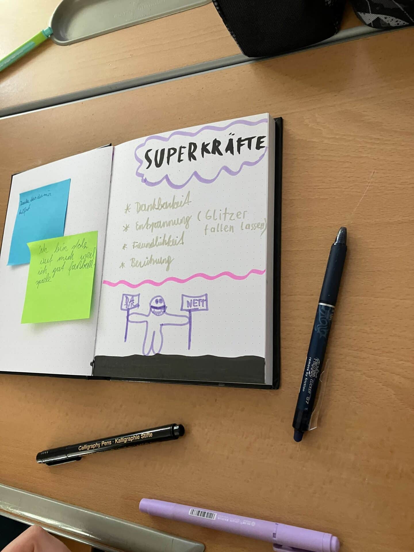 Die Superkraft ENTSPANNUNG aktivieren wir regelmäßig mit unserer Übung „Glitzer fallen lassen“ oder anderen Achtsamkeitsübungen, die wir bereits gemeinsam gemacht haben.
