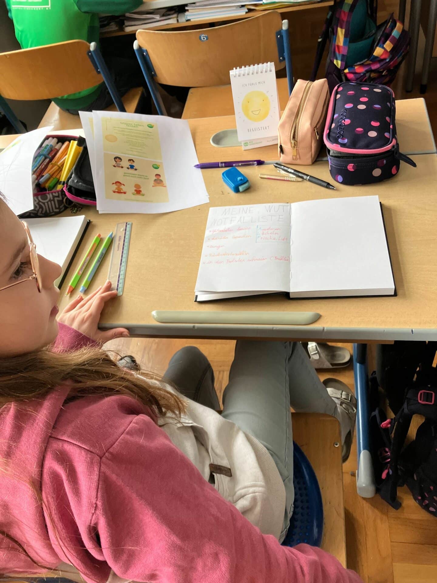 Danach durfte sich jedes Kind seine eigene „Wut-Notfalls-Liste“ in seinem Glückstagebuch zusammenstellen „Was kann ich tun, wenn ich wütend bin“ – eine ganze individuelle Liste, die zu ihr/ihm passt und im Umgang mit der Wut hilft. Beispielsweise „mein Haustier streicheln“ oder „mit jemandem darüber sprechen“ etc.