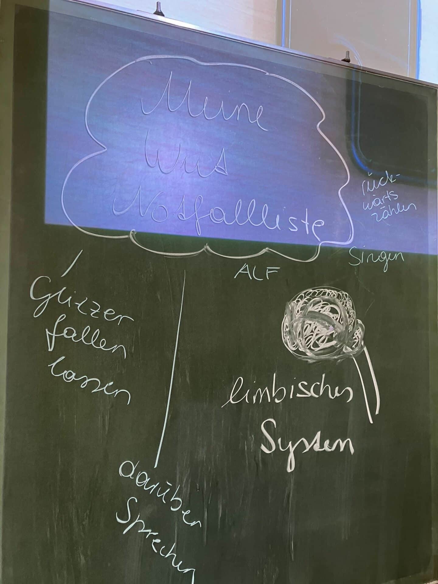 Wir haben besprochen, was in unserem Hirn passiert, wenn wir wütend sind. Und uns angeschaut, wo das limbische System wohnt und wie mächtig die Amygdala ist – und dass es sich lohnt, das Denken in einem emotionalen Prozess wie der Wut, die sehr heftig und kraftvoll sein kann, ins Frontalhirn zu bringen. Beispielsweise durch Methoden wie Rückwärtszählen, Ausatmen, Summen, Lächeln etc.